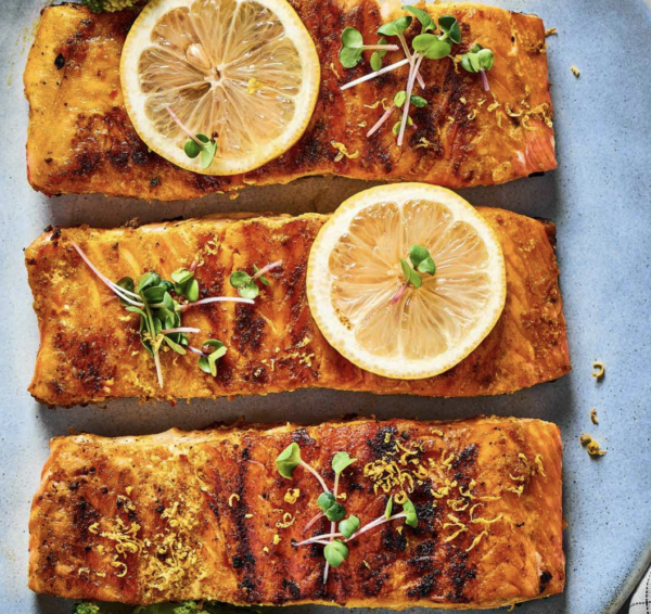 1 Pound Grilled Wild Salmon Seasoned with Lemon Pepper (Macros for 1 pound Wild Salmon 98G Protein, 56G Fat, 0 Carbs, 910 Calories)