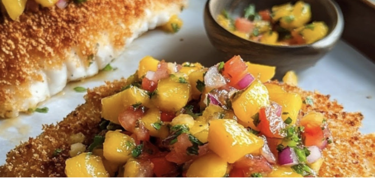 Oven Roasted Wild Sole Almond Crusted Sole, Creamy Mashed Potatoes, Broccoli, and Asparagus, Peach Chutney Salsa