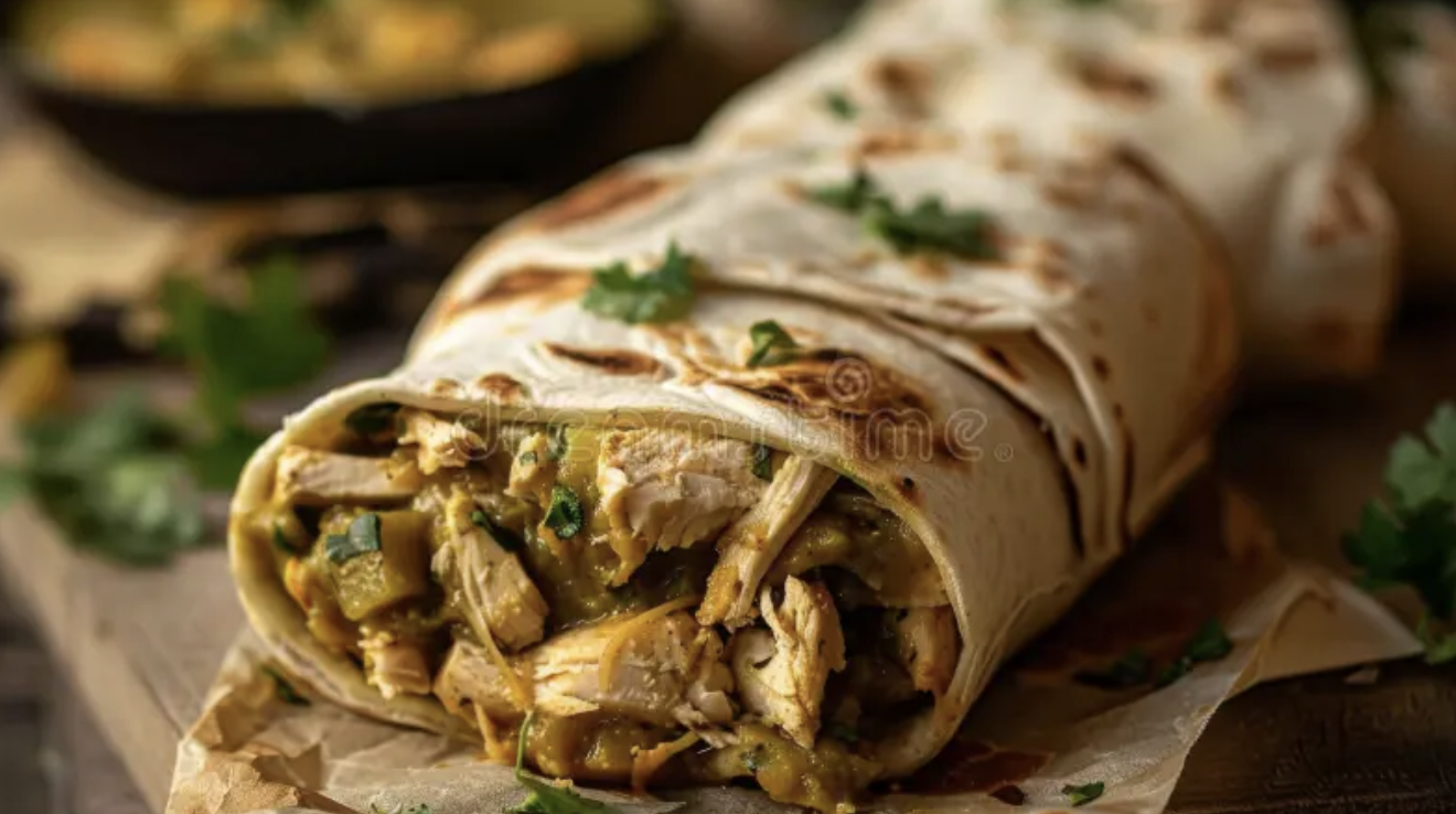 Grilled Chicken Slow Cooked with Garlic Tomatillo Salsa, White Rice, Pinto Beans, Low Carb Flour Tortilla, Side Low Fat Chipotle Adobo Sauce