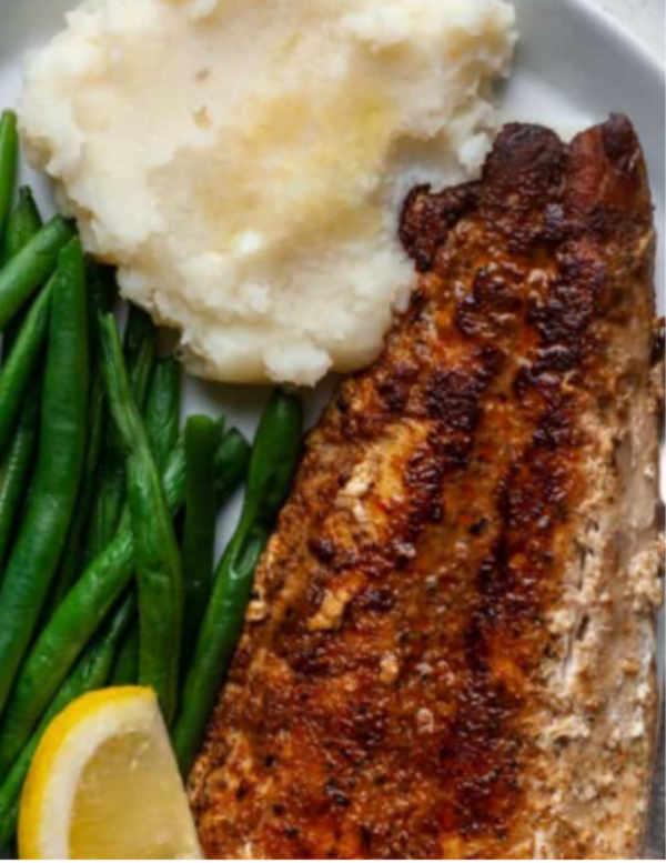 Cajun Blackened Wild Sole, Creamy Mashed Potato, Asparagus, Broccoli, Green Beans, Side of Non Fat Greek Yogurt Tartar Sauce