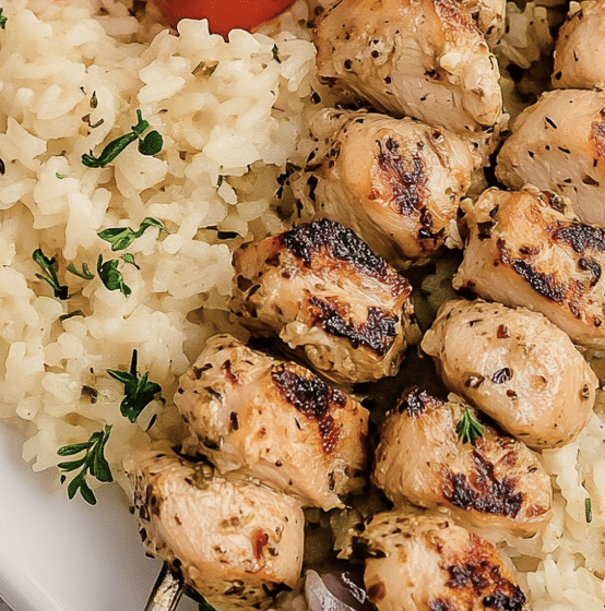 Greek Grilled Chicken Skewers, Creamy Lemon Risotto, Grilled Red Bell Peppers, Green Beans and Broccoli, Side Garlic-Herb-Lemon Yogurt Sauce