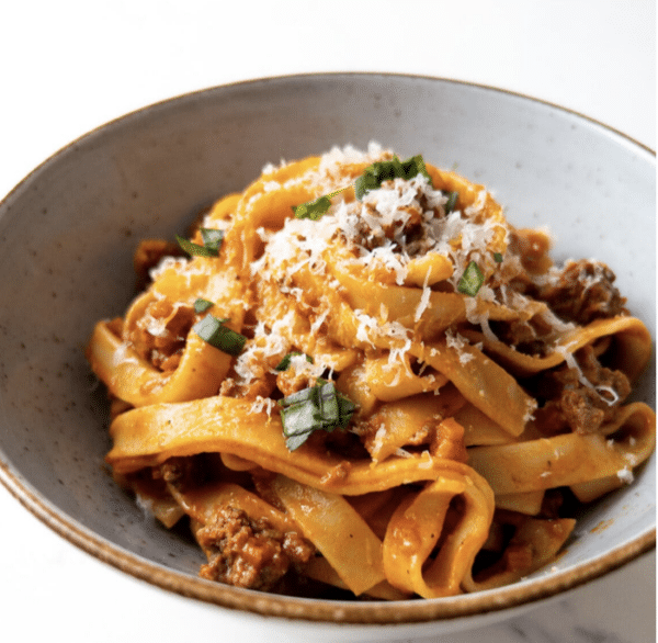 Harris Ranch Ground Beef and Basil-Garlic-Bolognese, Fettuccine Pasta, Grilled Asparagus, Fresh Parsley, Roasted Brussels sprouts, Parmesan Cheese