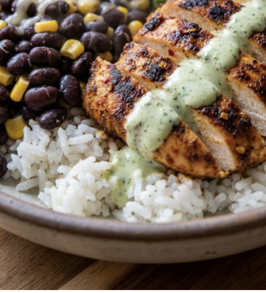 Grilled Jerk Seasoned Chicken, Steamed White Rice, “Dirty” Black Beans, Broccoli, Green Beans, Side Cilantro Lime Salsa