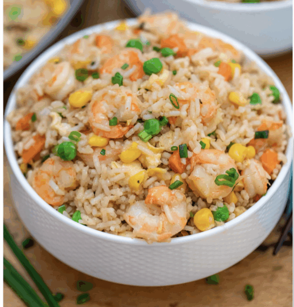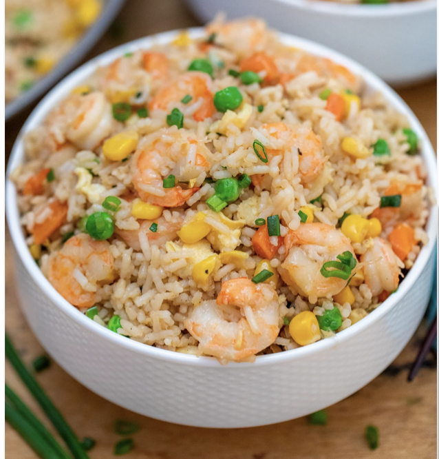 Garlic Shrimp Fried Rice, Fresh Spinach, Broccoli, Green Beans, Peas and Carrots, Side Chili Ponzu Sauce