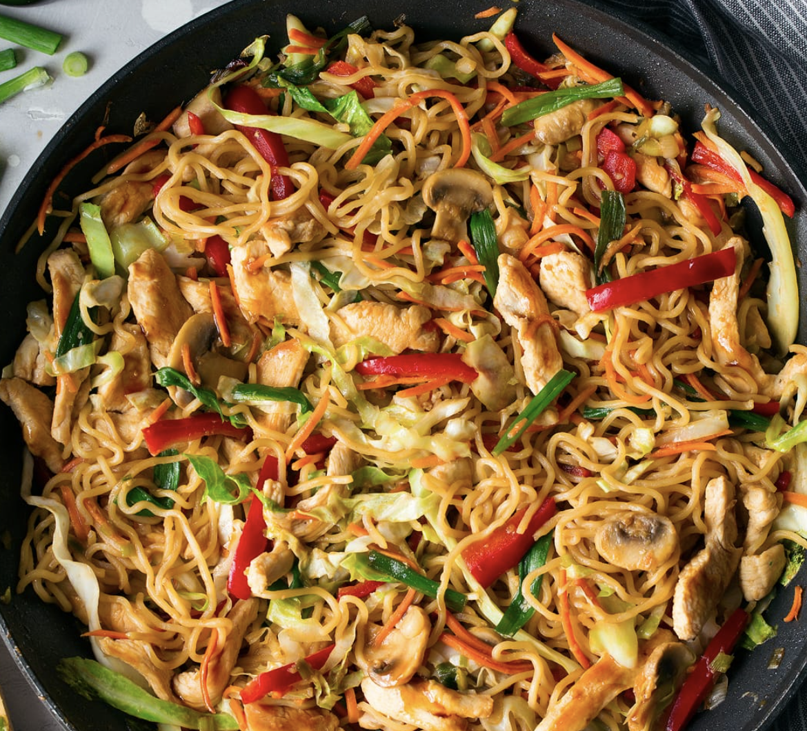 Grilled Turkey, Yaki Soba Noodles, Shaved Carrots, Grilled Bell Peppers, Broccoli, and Spinach, Side Spicy Japanese Ponzu Sauce