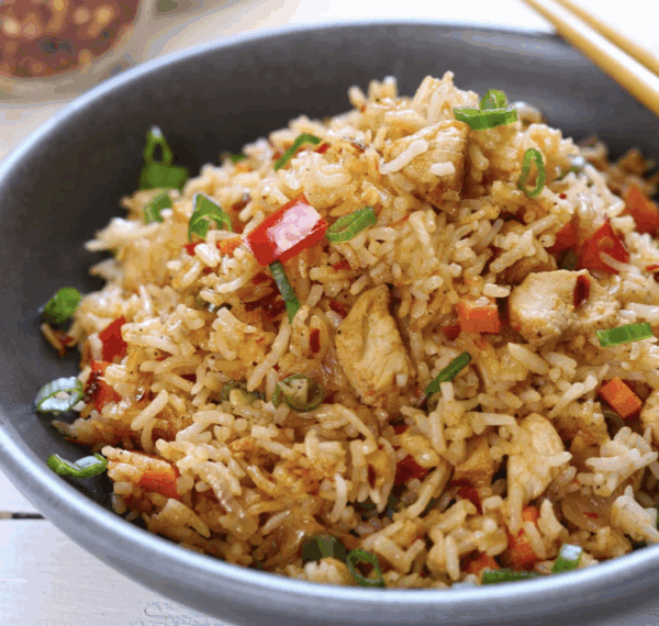Spicy Grilled Garlic Chicken, Fried Rice, Grilled Red Bell Peppers, Spinach, Broccoli, Roasted Carrots, Side Spicy Ponzu Sauce